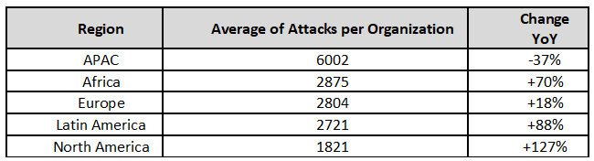 The APAC region has seen the most cyberattacks against organizations in the Education/Research sector since the beginning of the year, with 6,002 weekly attacks per organization. However, North America experienced the highest YoY increase with a 127% rise.
