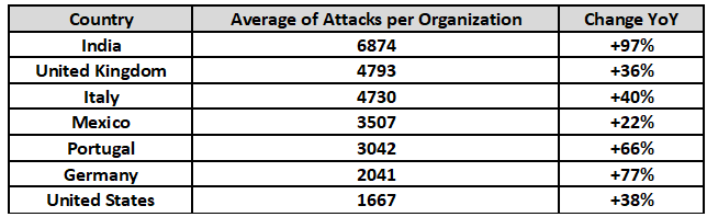 India is the most targeted country in the Education/Research sector, with 6,874 weekly attacks per organization, representing a 97% YoY increase. Other notable changes include Germany (^66%) and Portugal (^66%).