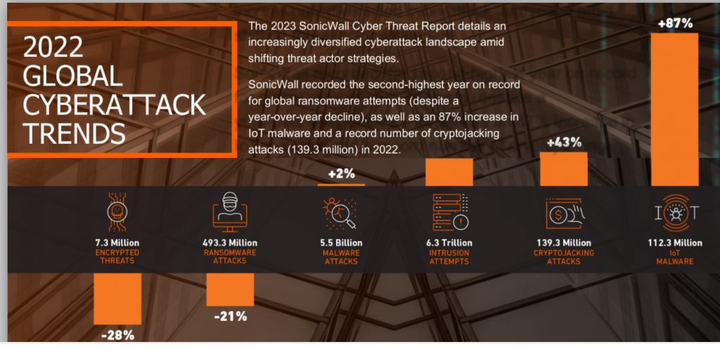 SonicWall has released the 2023 SonicWall Cyber Threat Report. The bi-annual report details an increasingly diversified cyberattack landscape amid shifting threat actor strategies. SonicWall recorded the second-highest year on record for global ransomware attempts, as well as an 87% increase in Internet of Things (IoT) malware and a record number of crypto-jacking attacks (139.3 million) in 2022.a