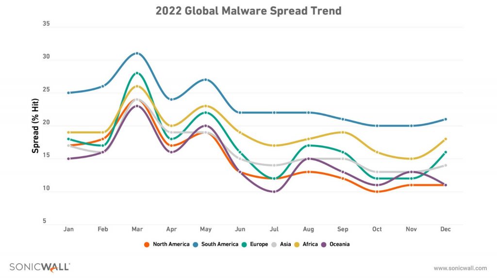 - Malware – Total volume was up 2% in 2022 after three straight years of decline — just as SonicWall predicted in the 2022 SonicWall Cyber Threat Report. Following that trend, Europe as a whole saw increased levels of malware (+10%) as did Ukraine, which had a record 25.6 million attempts, suggesting malware was used heavily in regions impacted by geopolitical strife. Interestingly, the malware was down year-over-year in key countries like the U.S. (-9%), U.K. (-13%), and Germany (-28%).
