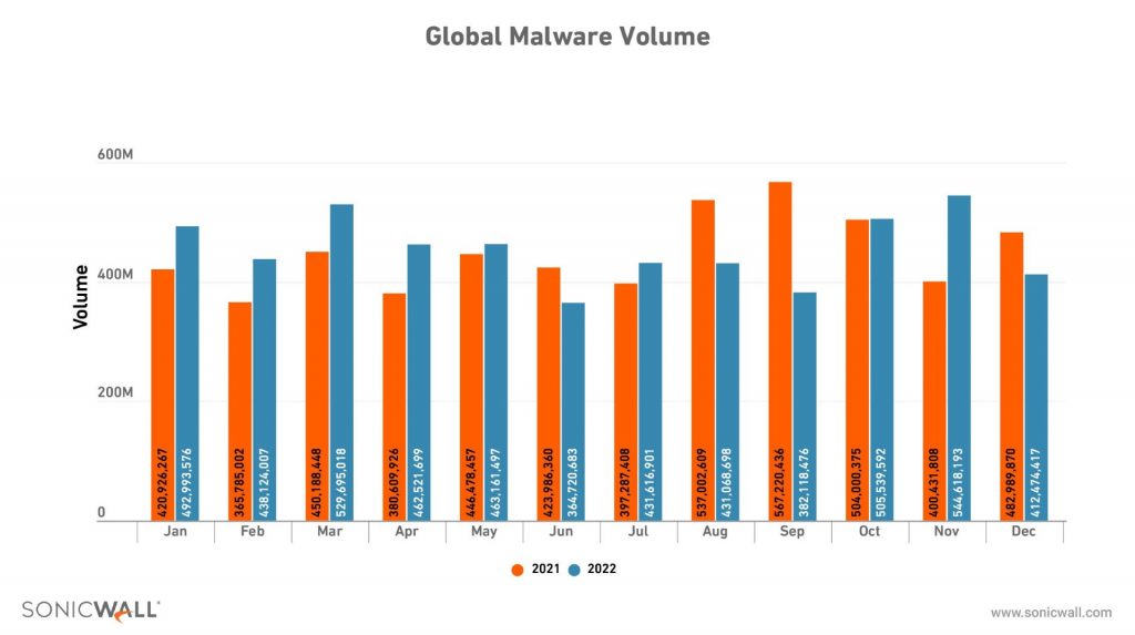 - Ransomware – Although overall ransomware numbers saw a 21% decline globally, the total volume in 2022 was higher than in 2017, 2018, 2019, and 2020. In particular, total ransomware in Q4 (154.9 million) was the highest since Q3 2021.