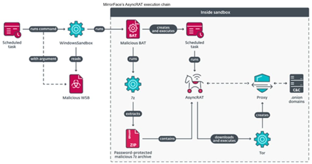 Additionally, MirrorFace deployed a heavily customized variant of AsyncRAT, embedding this malware into a newly observed, intricate execution chain that runs the RAT inside Windows Sandbox. This method effectively obscures the malicious activities from security controls abilities to detect the compromise. In parallel to the malware, MirrorFace also started deploying Visual Studio Code (VS Code) to abuse its remote tunnels feature. Remote tunnels enable MirrorFace to establish stealthy access to the compromised machine, execute arbitrary code, and deliver other tools. Finally, MirrorFace has continued to employ its current flagship backdoor, HiddenFace, further bolstering persistence on compromised machines.