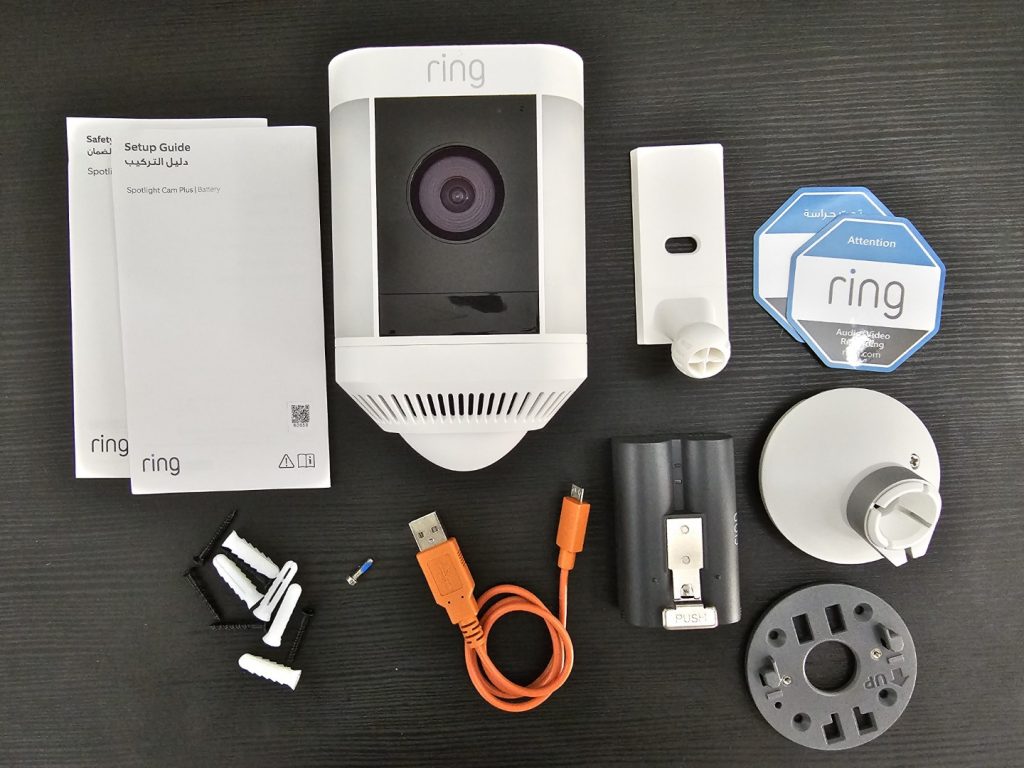 Inside the box, you get the Ring Spotlight Cam Plus, a quick-release battery pack, a USB charging cable, a mounting bracket, and some screws for installation. The setup procedure is a breeze. First, download the Ring app onto your smartphone. Next, install the battery by rotating the base section and inserting the battery pack in place. Then follow the onscreen instructions on the Ring app to complete the setup.