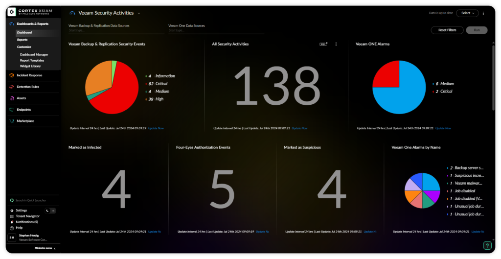 The integration introduces two new applications – the Veeam apps integrated with Cortex XSIAM and Cortex XSOAR that leverage a bi-directional API connection to monitor, detect, and respond to security incidents impacting critical business data and data backups. The Veeam app integrated with Cortex XSIAM brings data from Veeam Backup & Replication™ and VeeamONE environments into Cortex XSIAM, providing a centralized view of data and backup security-related activity. The Veeam App integrated with Cortex XSOAR enables regular API queries against Veeam Backup & Replication and Veeam ONE, monitoring for significant security events or alerts. Both applications are included at no charge to Veeam Data Platform Advanced and Premium customers.
