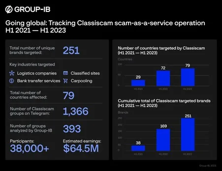 Since the second half of 2019, when the Group-IB Computer Emergency Response Team (CERT-GIB) in cooperation with the company’s Digital Risk Protection unit first identified Classiscam’s operations, 1,366 separate groups leveraging this scheme have been discovered on Telegram. Group-IB experts examined Telegram channels containing information pertaining to 393 Classiscam groups with more than 38,000 members that operated between H1 2020 and H1 2023. During this period, these groups made combined estimated earnings of $64.5 million.