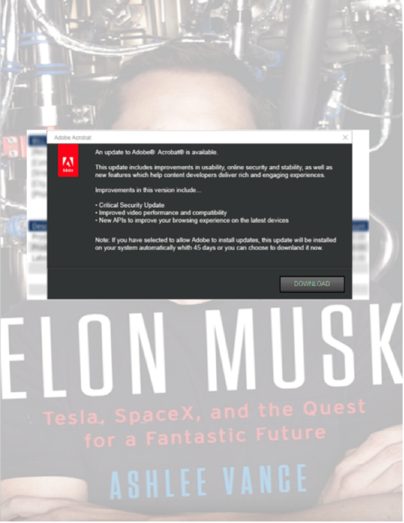 With a subject line of “You win a trip to Mars,” the messages contained a PDF featuring an image of a recent Elon Musk biography and a spoofed update dialogue for Adobe Reader. The download button on the fake image linked to a tar.gz file containing an executable that ultimately downloaded Redline Stealer.