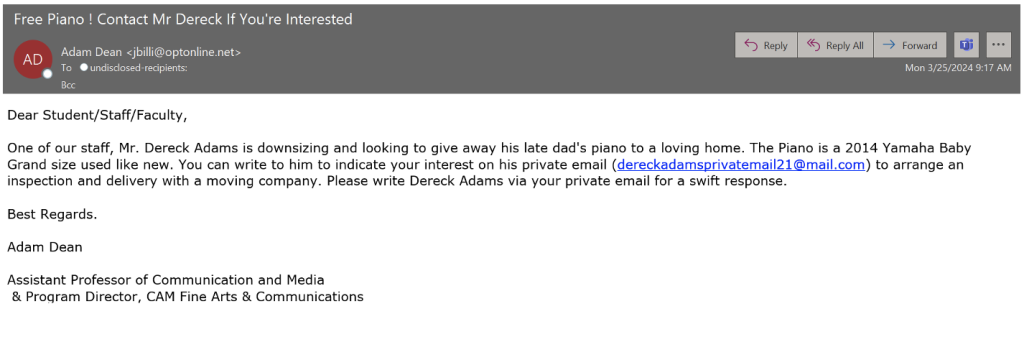 Equally unusual, another peculiar lure observed by Proofpoint involves a piano giveaway scam. In the campaigns, the threat actor purports to offer up a free piano, often due to alleged circumstances like a death in the family. When a target replies, the actor instructs them to contact a shipping company to arrange delivery.